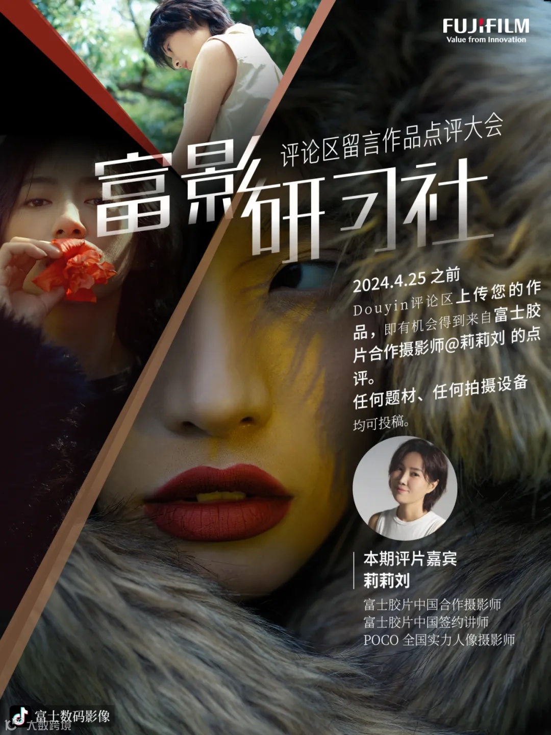 不清楚什么样的作品更容易获奖?想知道自己的作品如何提升?街头霸王挑战赛评委团成员轮流做客“富影研习社”在线点评投稿作品,为你提供细致的参赛指导。敬请关注富士数码影像官方抖音账号上传您的作品。