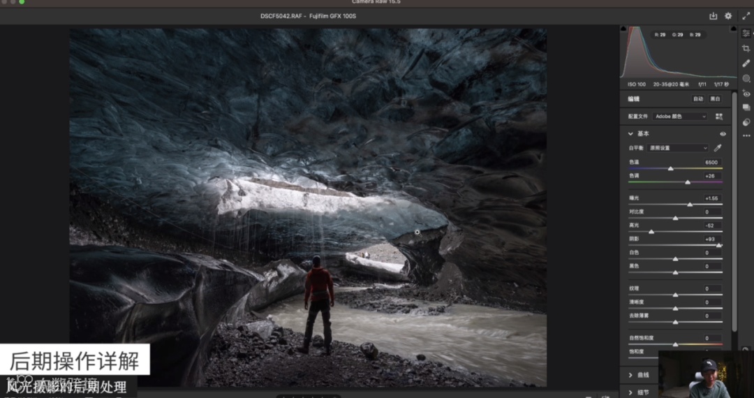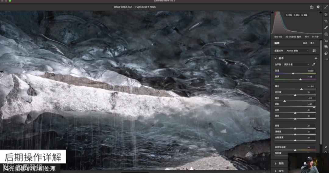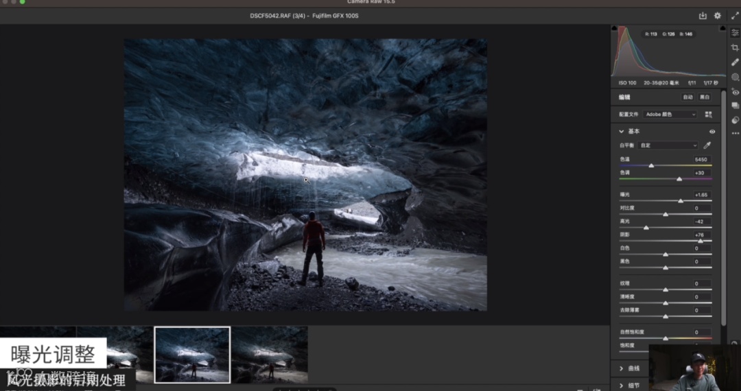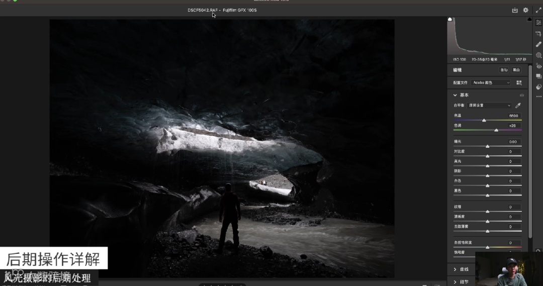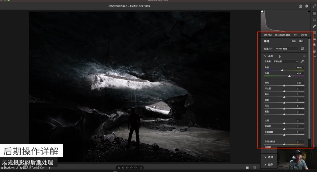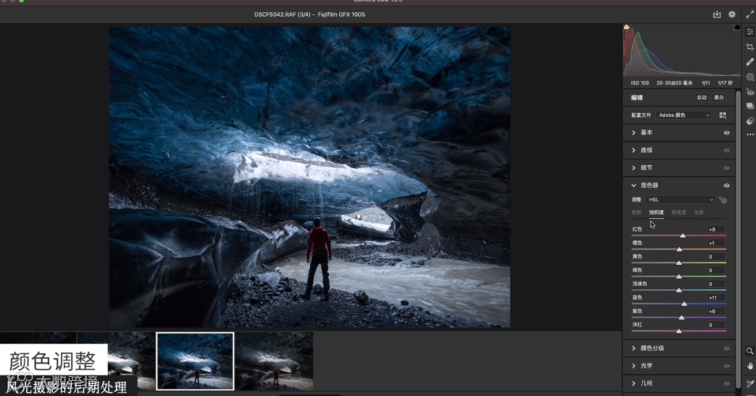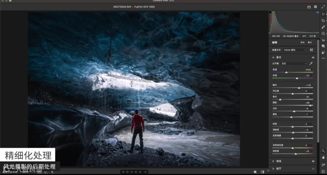这张照片拍摄的是冰岛的蓝冰洞,我希望它能有一种蓝冰洞的感觉。蓝冰洞本来很蓝,但经过相机拍摄后看起来没有那么蓝。所以在后期时,我把它的色温稍微降低一点,阴影提一点,整个蓝冰洞就看起来更蓝了。