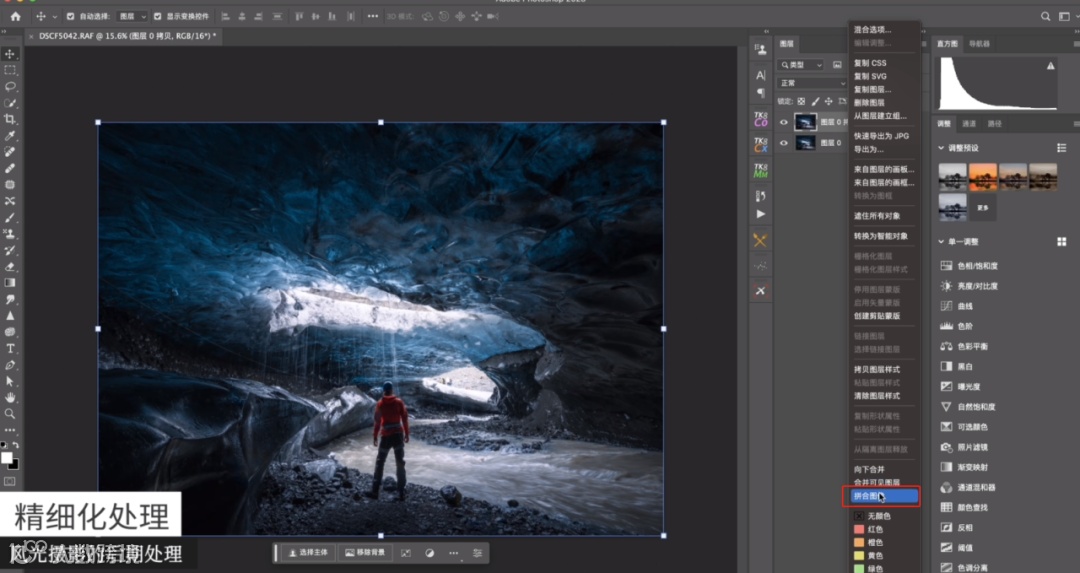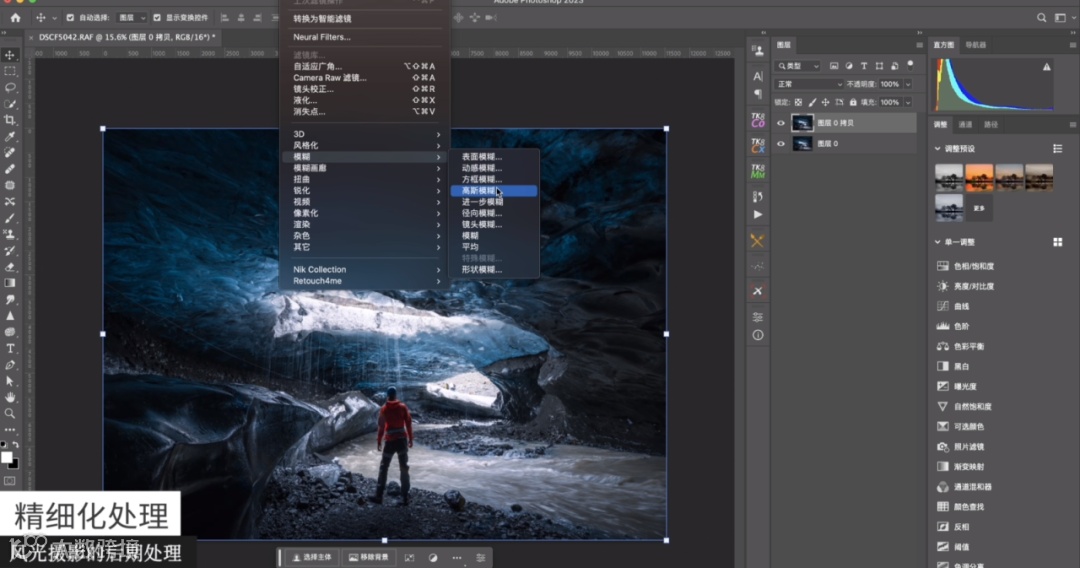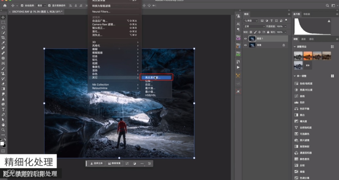 完整这一步之后,只需要去做一个输出锐化就可以了。先拼合一个图像,再去新建一个图层,选择滤镜-其他-高反差保留,之后可以使用混合模式柔光,可以看到冰洞边缘的细节就变强了,这是输出的第一步锐化。