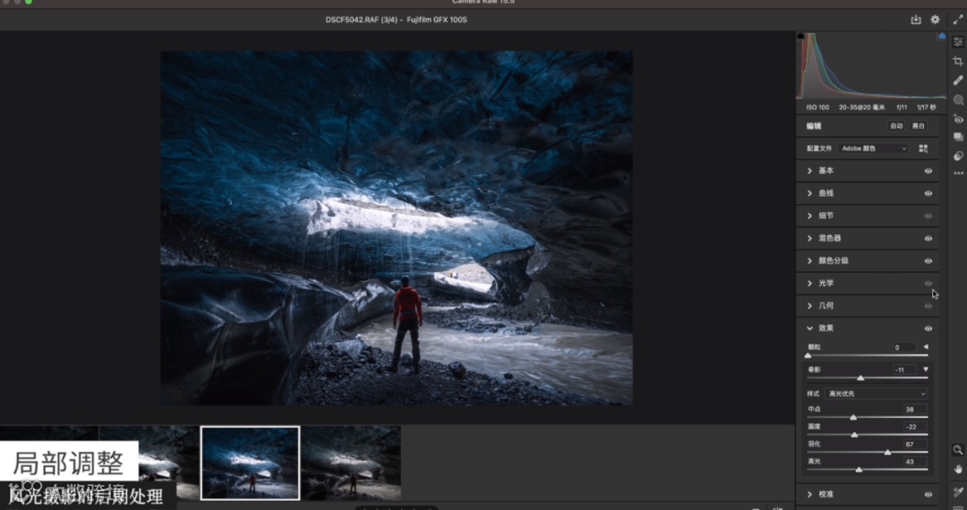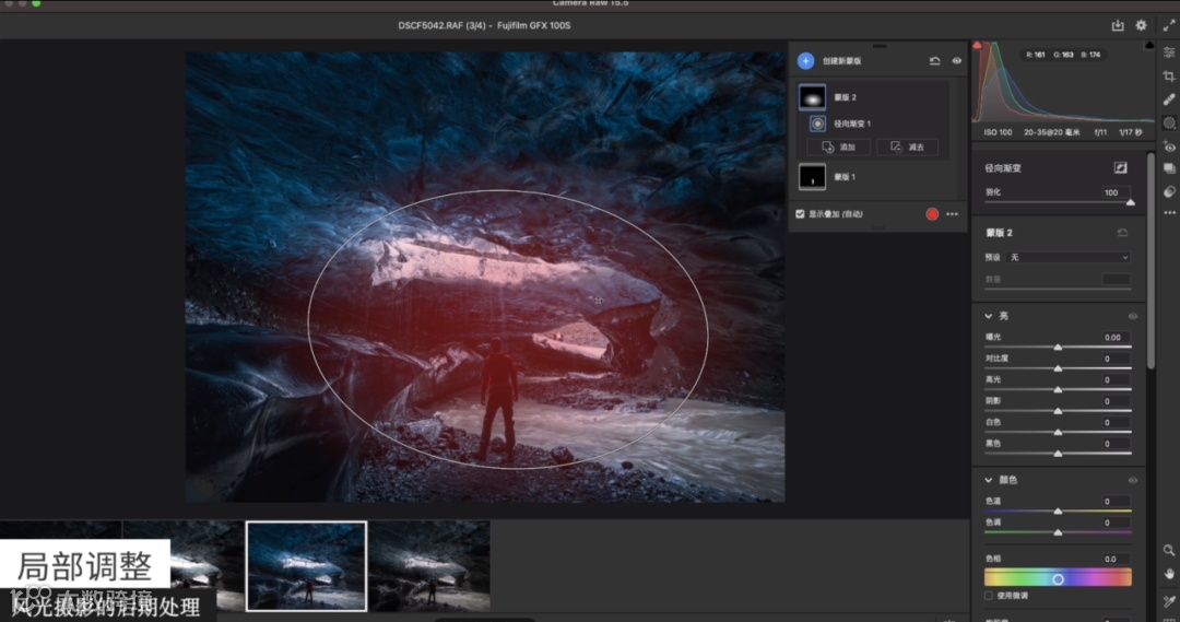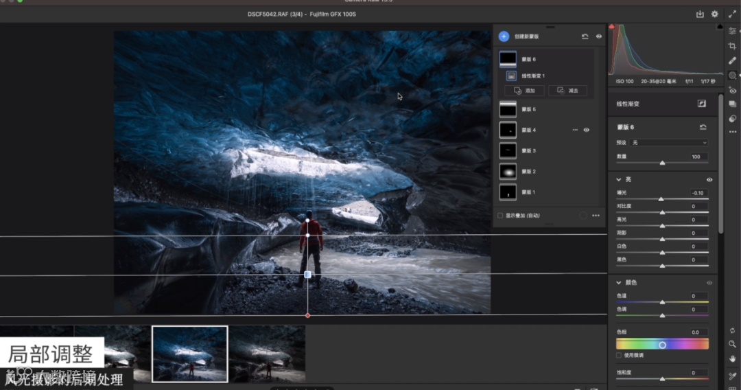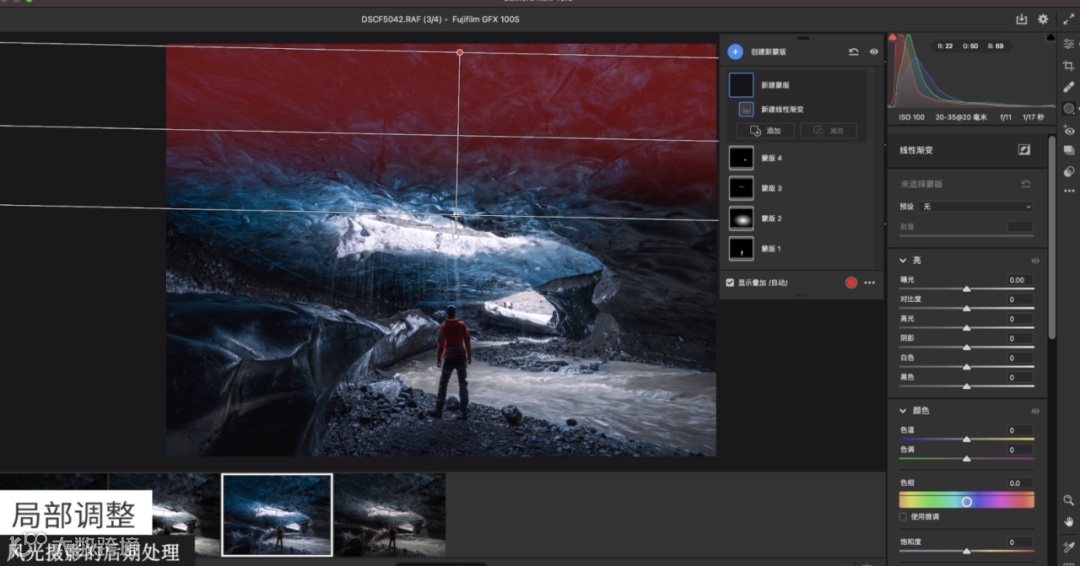 完成局部增强后,接下来需要把四周压暗。光线光源的辐射是从入口处开始的,越靠近洞里面的视角是越暗的,这里就需要通过线性渐变去压暗,从而突出中间的主体。