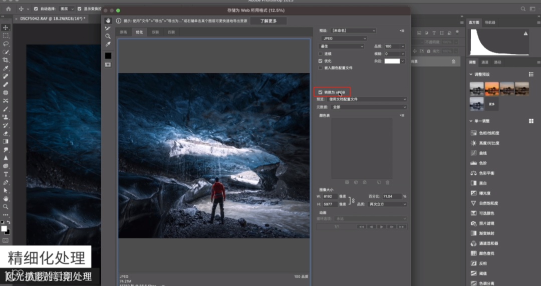 然后就可以存储照片了。选择导出-存储为Web所用格式,要选择转换成sRGB,因为手机以及所有的网页都是支持sRGB的。除此之外,原数据也需要注意,如果选择全部,那么所有的版权信息都是保留的。