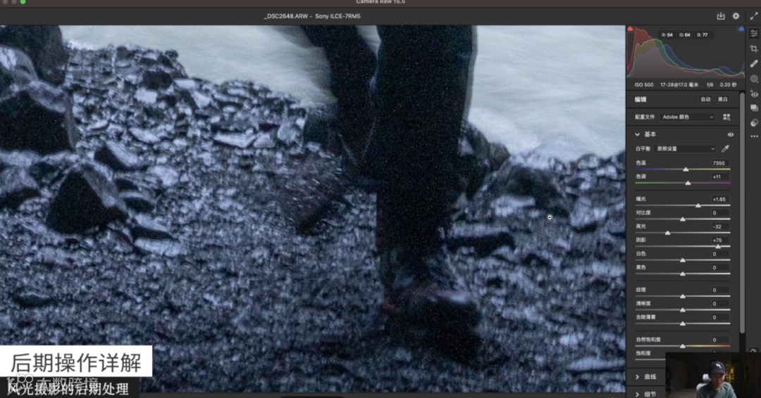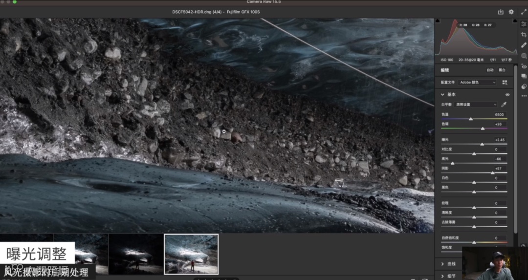 首先分析它的曝光,如果曝光不准,可以把曝光拉一下以及阴影稍微拉起来一点,然后把高光压到一个准确的数值,让直方图看起来稍微正常一点。