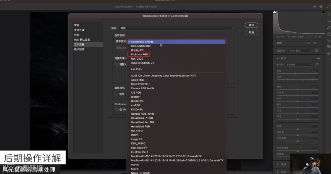 打开这个界面后,第一件事要把Camera首选项打开。里面的色彩空间要点开使用Adobe RGB或者是Pro photo RGB,因为它们的色深都是最大的,然后色彩深度要改成16bit。