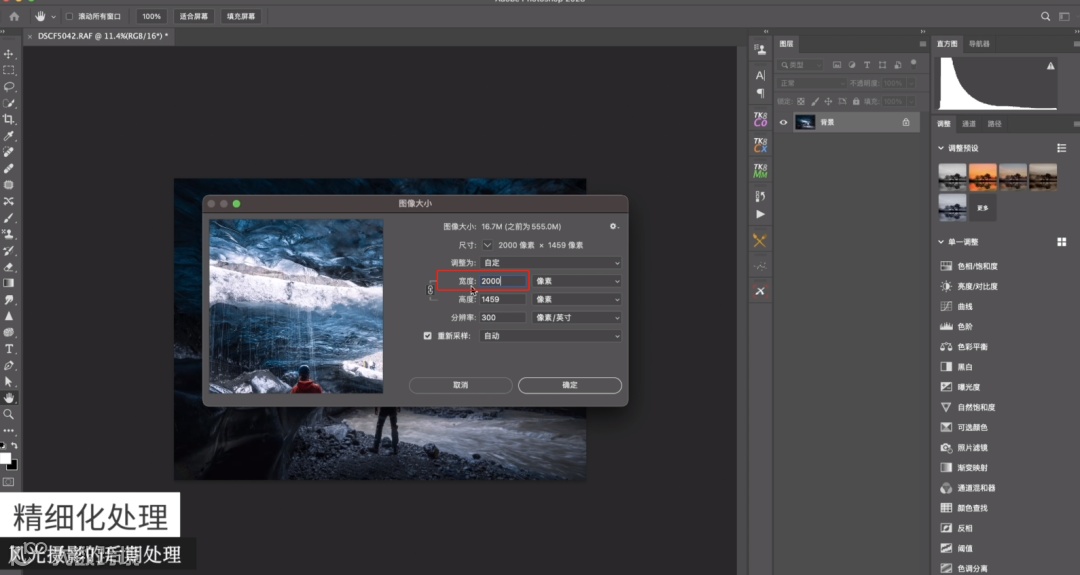 还有一种情况,假如是需要小的照片可以使用输出锐化。先把宽度降到2000,然后再去进行锐化。这样就可以看到它所有的细节,且不容易被手机或者Web端压缩。