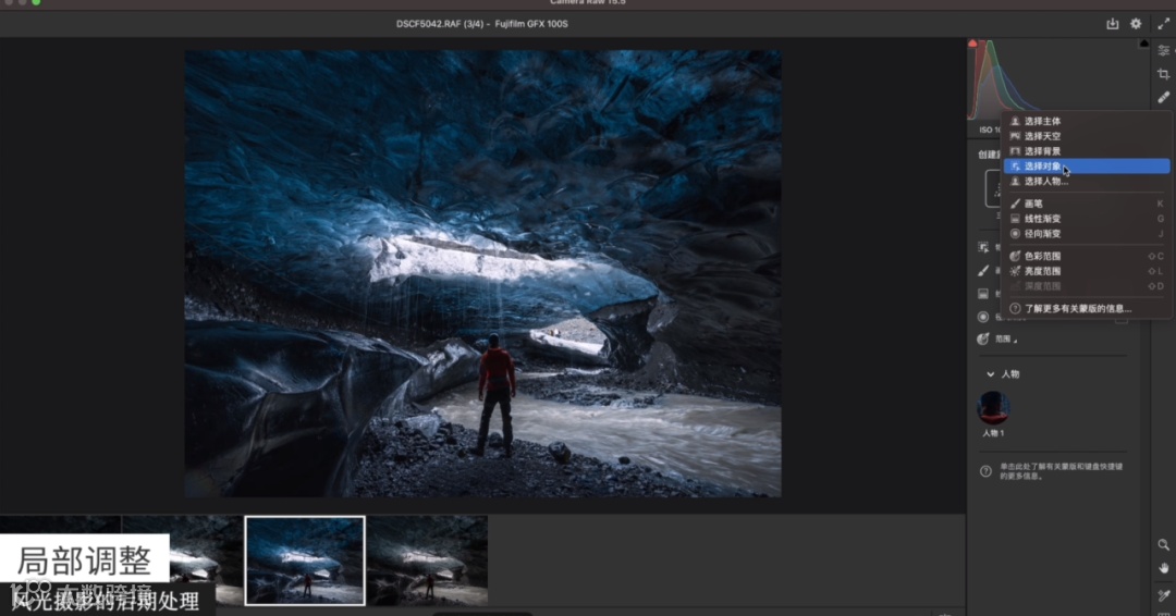 接下来进入到局部的处理工具,可以看到这里面有选择主体、选择天空、选择对象。新版的软件有了AI的加持可以很快选择出主体。