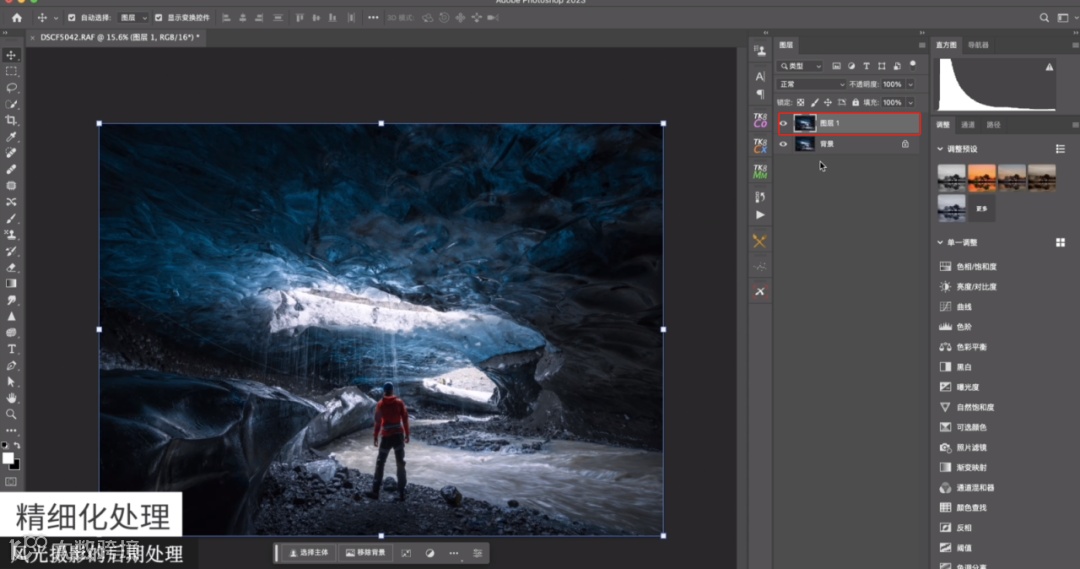 做到这种程度后,可以进行二次构图。我想让这张照片不这么宽,所以稍微去裁切一点,这张照片在camera里面就做完了,做完之后只需要点击打开,它就会自动载入到Photoshop里面。