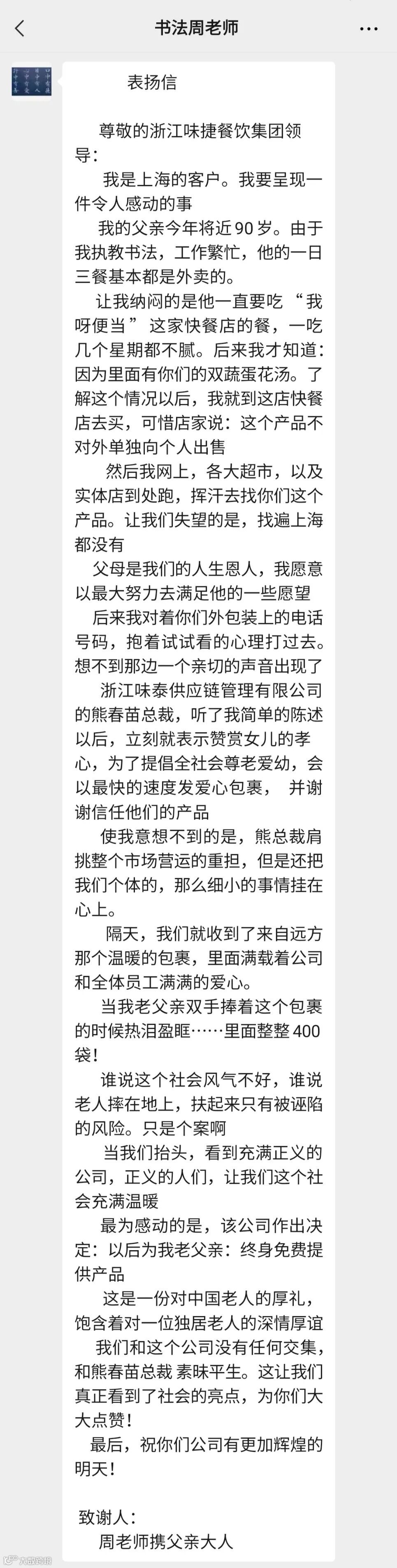 这封表扬信来自上海一位64岁的书法老师周老师,他代他90岁的父亲向味泰供应链及总裁熊春苗先生致以真挚的感谢。