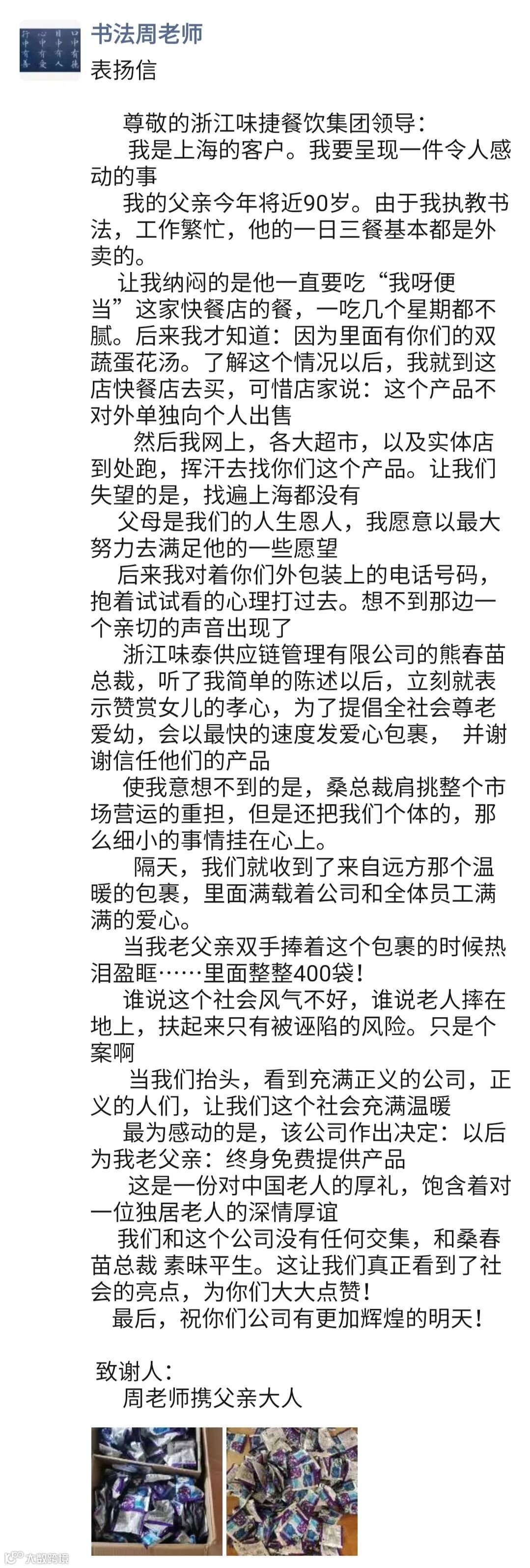 熊总的这一举动,也令周老师和其父亲大为感动。周老师收到包裹后不久,就写下了这封表扬信,并分别发表在他的朋友圈、微博等分开渠道,同时也发给了味捷集团、味泰供应链和熊总。