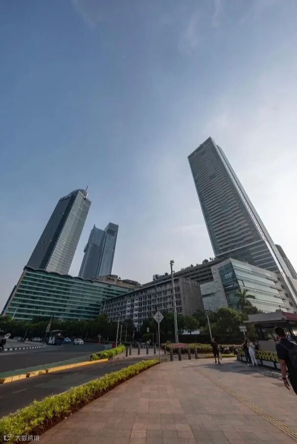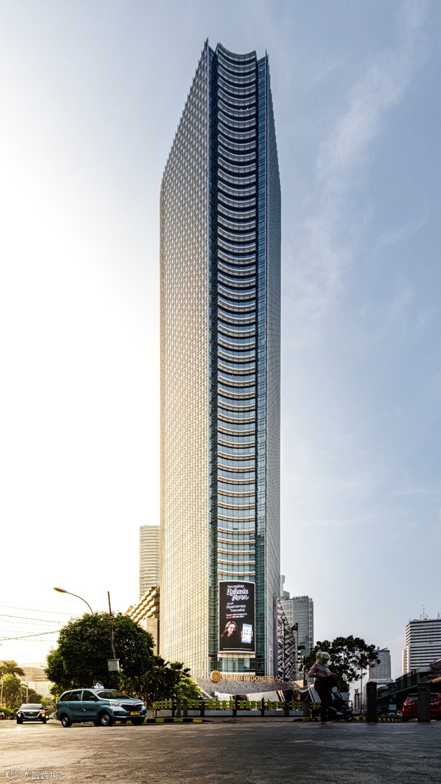 这里要提到透视变形和镜头畸变,这是两个概念。给大家举个透视变形的例子,这个是印尼首都雅加达的一个CBD的高楼,我们使用超广角从低处往高处仰拍,就会拍出近大远小的效果,这个叫做透视变形,因为我们在下边往上仰拍,是自然而然造成这种透视变形的效果。
