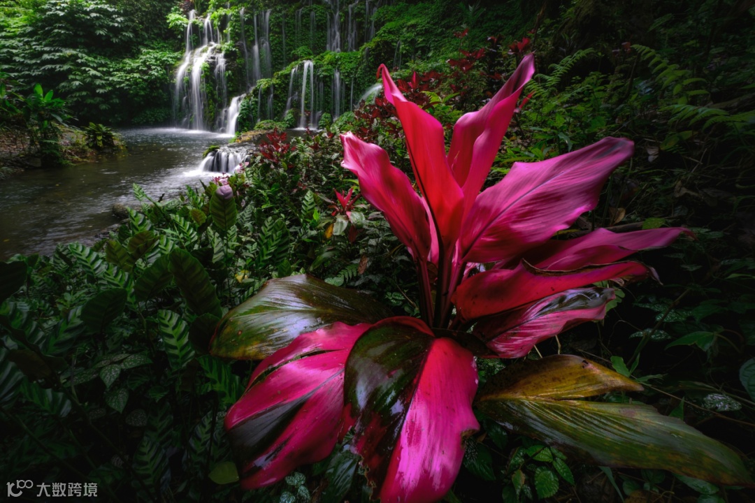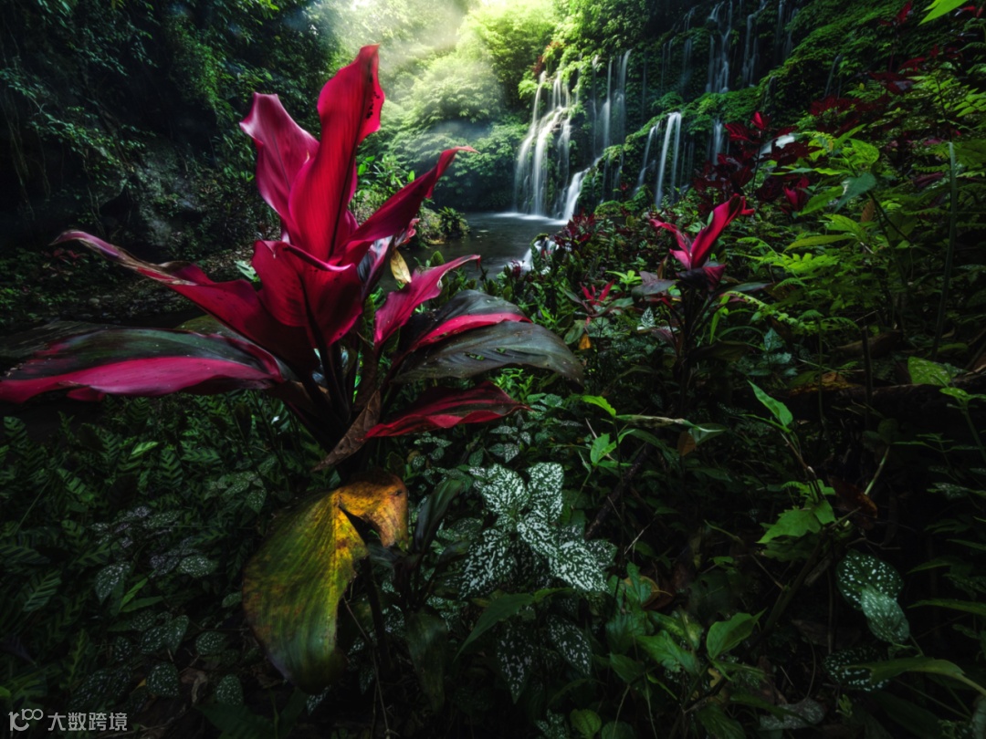 这个是在印度尼西亚非常有名的一个瀑布公园,前景是一种比较小的植物,叫做朱蕉。借助超广角能够带来的透视和冲击力,我们靠近前景,通过最近对焦距离,可以把这种透视关系夸张得很大,看这张照片,朱蕉其实很小,而这个超广角镜头怼到植物的面前,就可以得到冲击力非常强的一张照片。当一支镜头最近对焦距离越近,意味着你能离前景越近,也就意味着你拍出来的照片前景会更大,背景会更小,这种层次感和空间感会更强,这就是超广角带来的最核心的一种视觉效果。