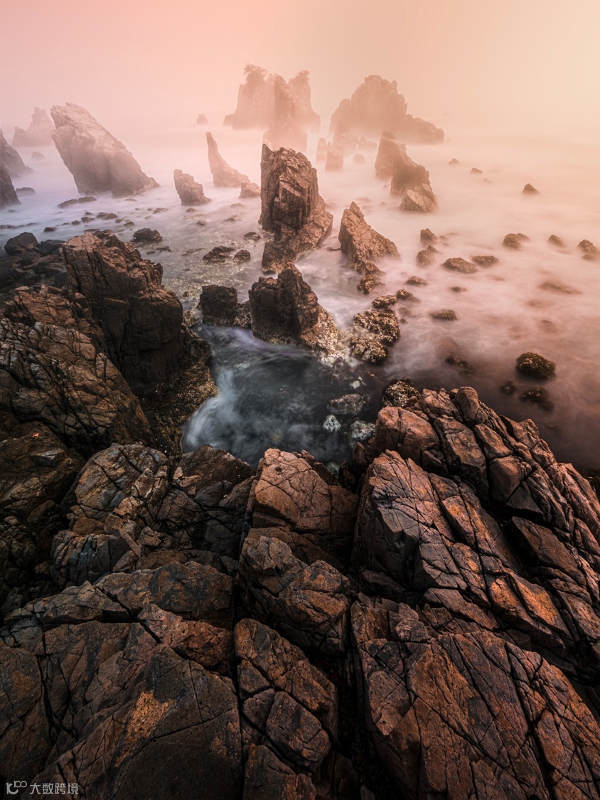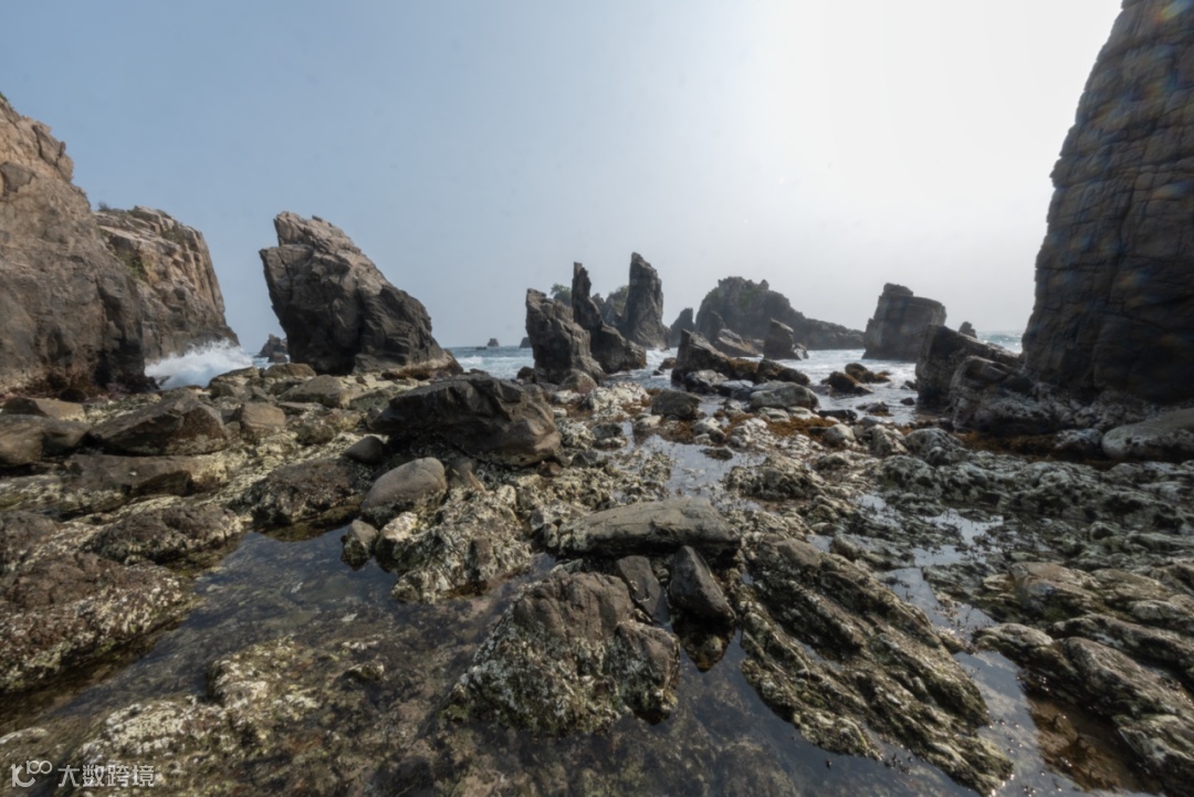 这是一个非常狭小的石缝,我拍到刚好从我前面的石头打过来的海浪的照片,这个浪很小,这张照片的左右两边是一样的,我可以通过超广角的拉伸,把左右两边的物体组合成我的前景,就是大家熟知的框架构图,这个也是超广角可以给我们带来的一种效果。这两张照片都是8mm拍摄的,一个是左右两边的前景,一个是正下方的前景,大家都可以去尝试这个技巧。