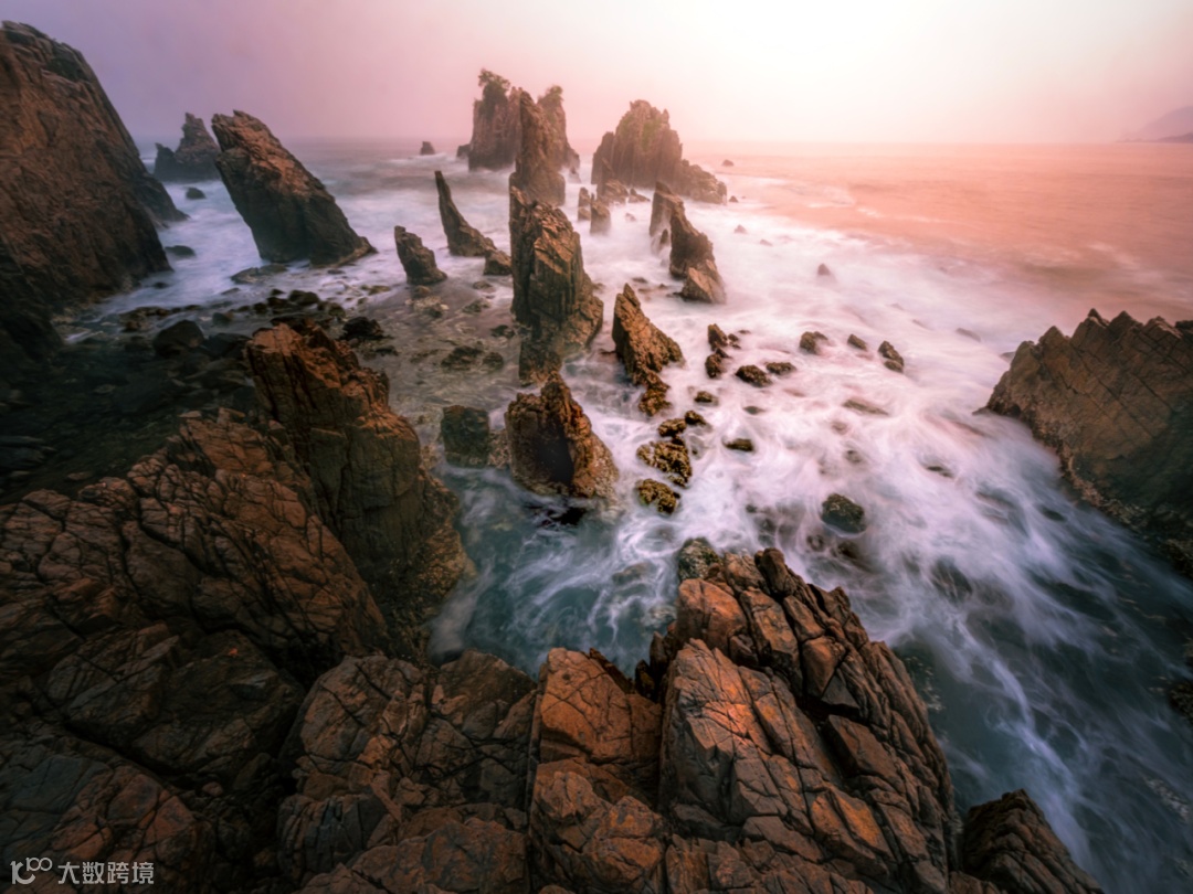 还有一种玩法是手持。刚刚的礁石看起来平平无奇,但是当我们用超广角去拍,把礁石放到图片边缘的时候,它被拉伸了,石头一下子就变得有气势了,这也是超广角能够带来的一个效果。大家再看右下角,有海浪的泡泡纹路,是使用一个慢门0.8秒拉伸出来的效果,很多照片都是依靠超广角镜头的特性,把画面中很不起眼的一些小物体放得很大,从而形成一张照片的亮点,这是风光摄影的奥秘。