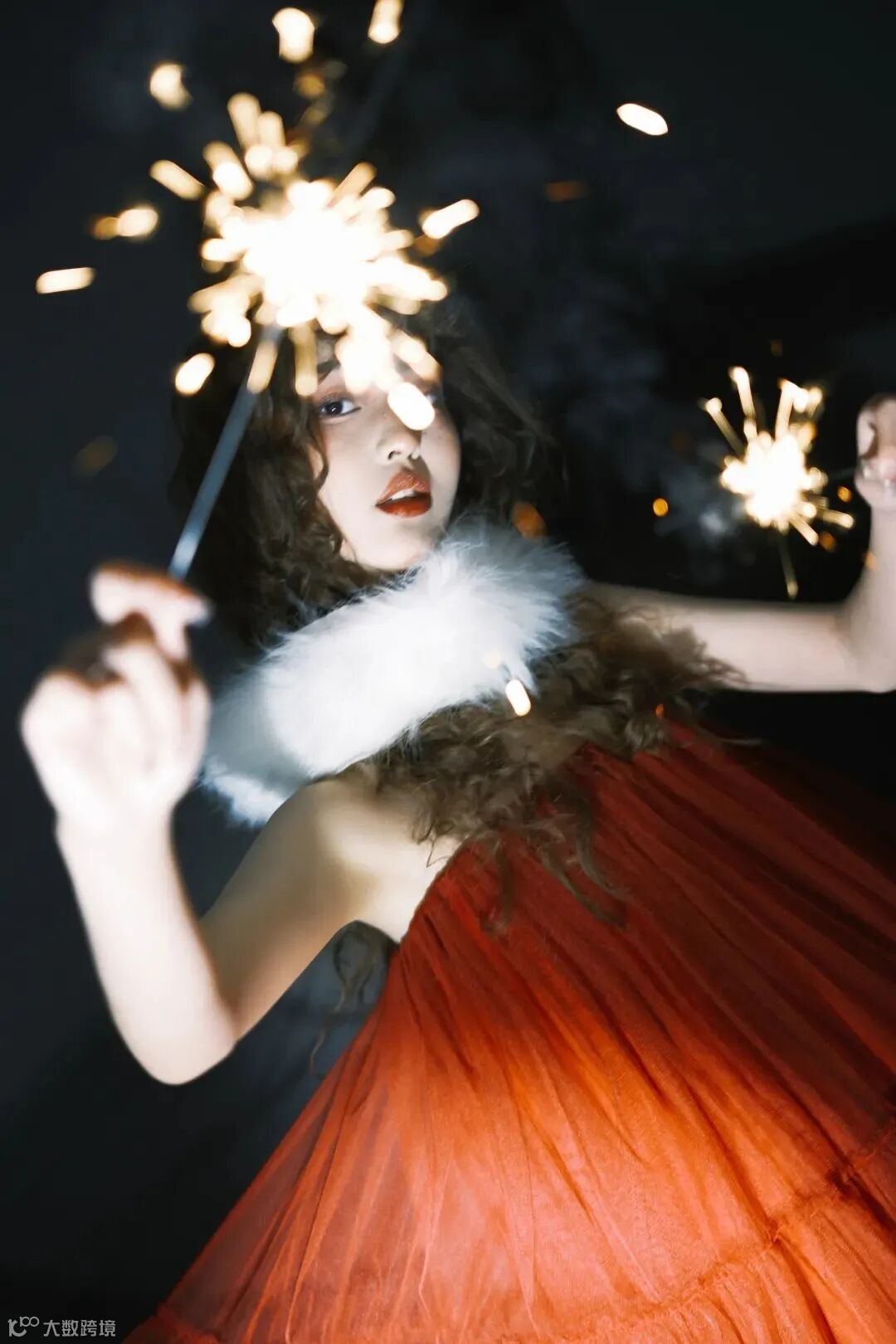 这组拍摄使用了黑色背景,加上单灯进行些补光,打开高速连拍模式,抓拍烟花与人物之间的互动。毛茸茸的围脖也增添了画面的一抹高光亮色,起到均衡提亮画面影调的作用,同时也显得比较温暖,迎合新年冬日氛围。