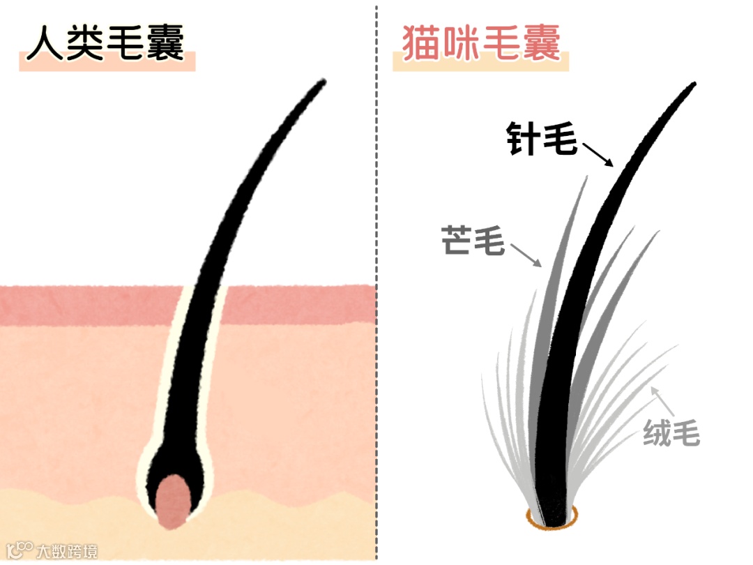 猫咪有着与生俱来的优势,它们每个毛囊里都有一根针毛、十几根芒毛和上百根绒毛(无毛猫除外)。而我们的毛囊里有一根就已经偷笑了(哭哭)