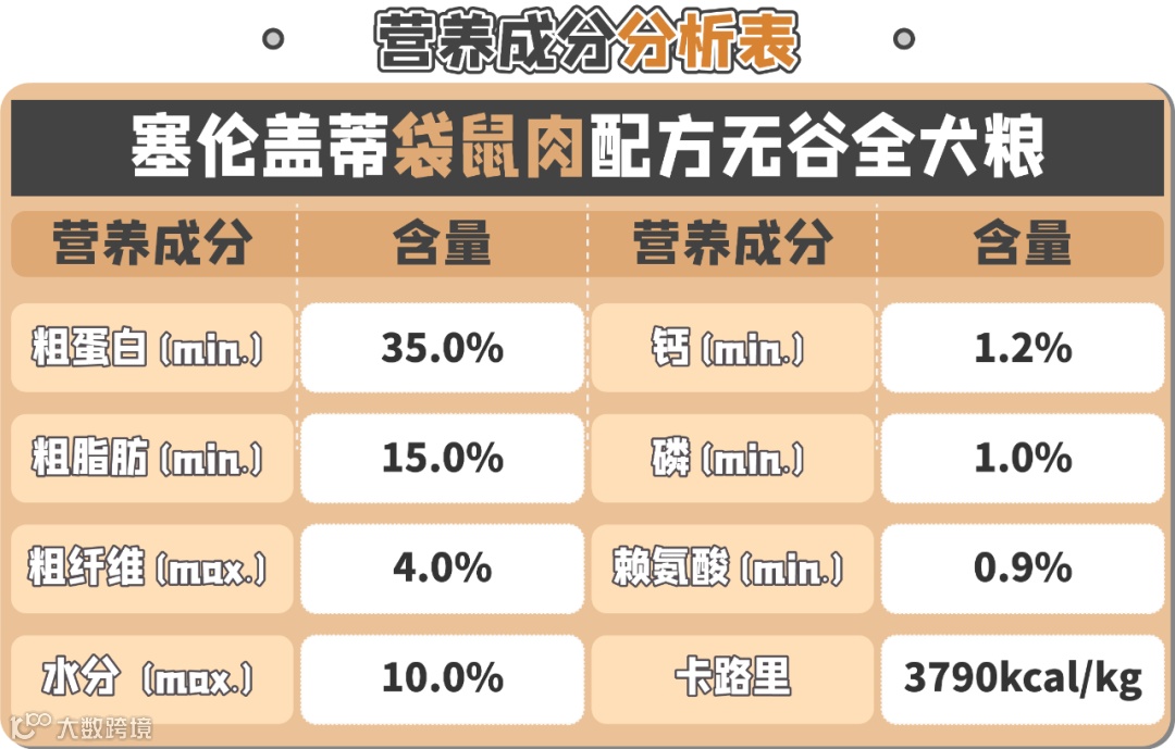 那么它的配方和营养成分究竟如何呢?我们以袋鼠肉配方狗粮来分析一下: