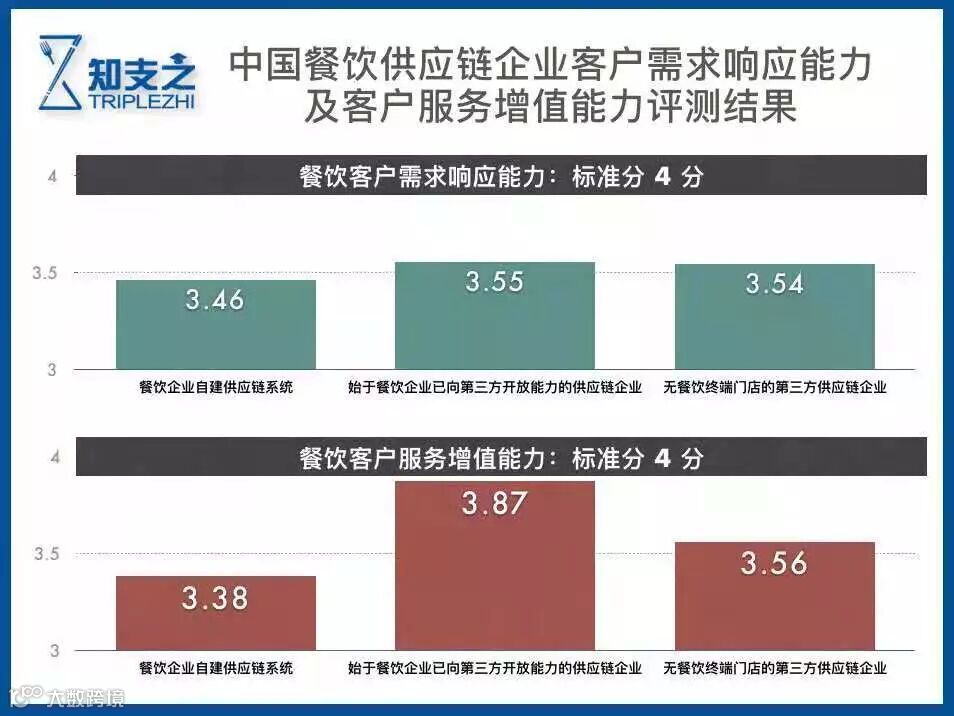 经过分析之后发现一个有意思的现象:虽然餐饮供应链企业的客户服务水平都有较大的提升空间,但相比之下,连锁餐饮企业自建系统并已经向第三方开放的供应链企业在客户服务增值能力方面更为突出。