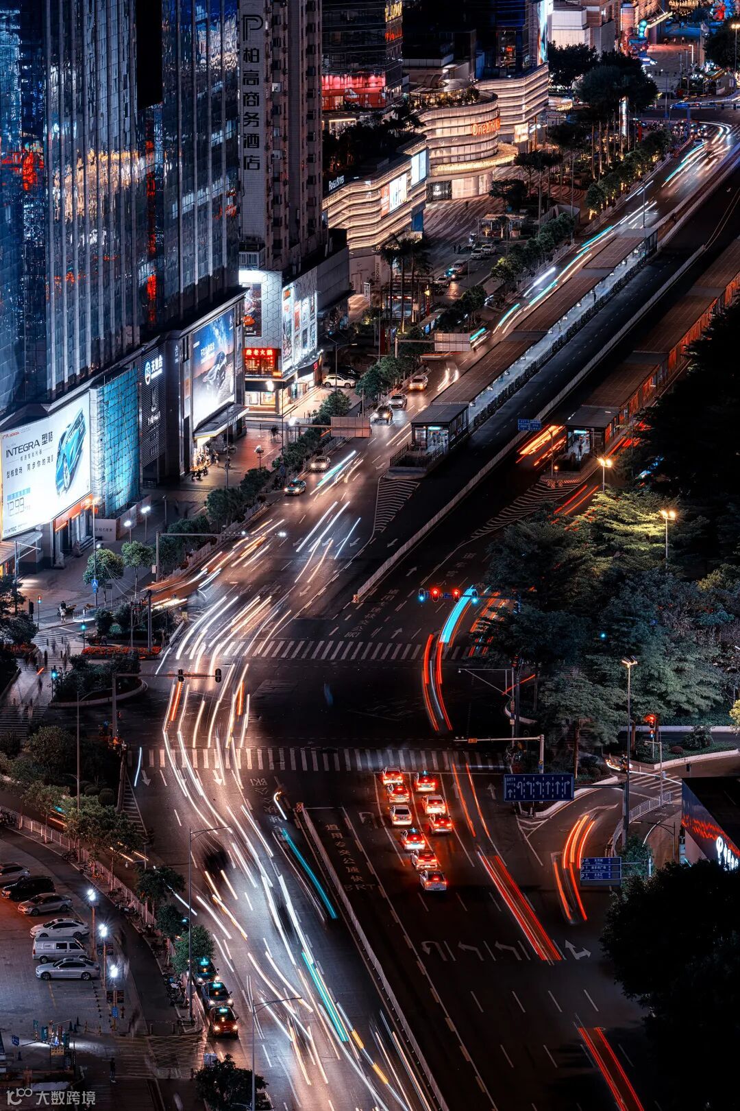 车水马龙的天河路也是非常值得记录的场景,当我从高层建筑向下拍摄时,长焦焦段能够呈现出道路的蜿蜒感。此时,我使用160mm的焦段和2.5秒的长曝光,记录了车流的灯光轨迹,更加凸显出入夜的氛围感。