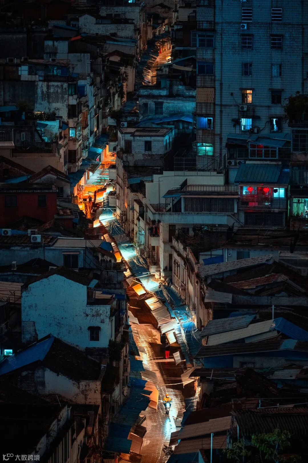 同样地处老城区的“北京路高第街”是一条千年古街,用常规的角度去拍摄这条老街,会因为周遭比较杂乱而无法拍出层叠蜿蜒的效果。因此,这时如果我们使用长焦焦段从远距离拍摄,便可突出整体空间的表达。拍摄上图时,我特意找了一个下雨的夜晚,等待人物出现在画面近端时,果断按下快门。