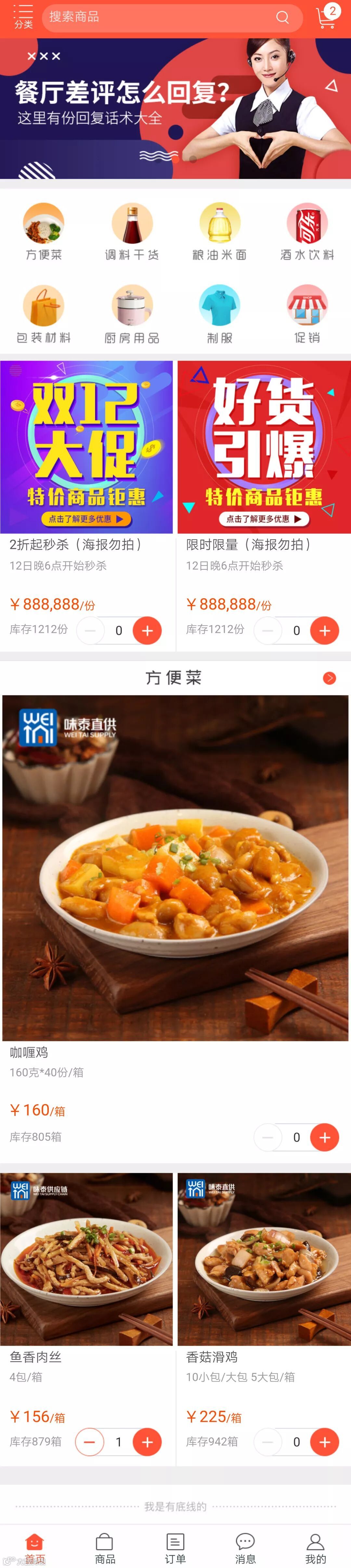 全新改版上线的“味泰供应链”APP,UI设计更简洁、时尚,下设方便菜、调料干货、粮油米面、酒水饮料、包装材料、厨房用品、制服和促销8大版块,方便加盟商更快速地找到想到订购的产品。