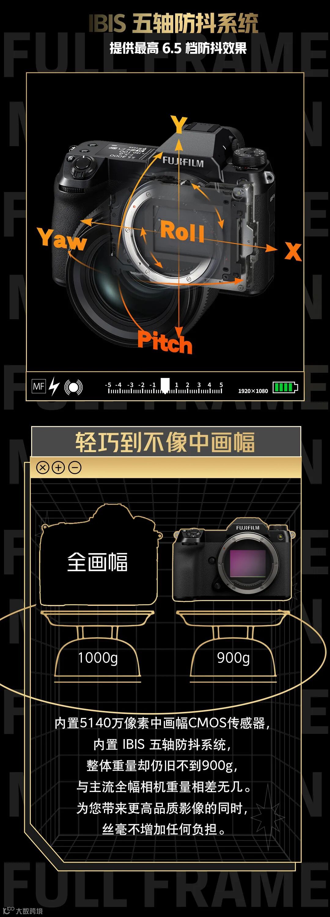 这台全新的 GFX50S II 的机身只有 900g,配备了 5140w像素的CMOS. 在减轻了机身重量的同时,也保证了画质。