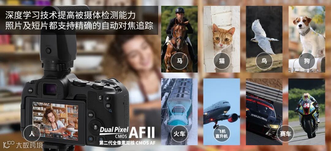 全像素双核CMOS AF II + 先进的EOS iTR ※2 AF X(智能追踪与识别自动对焦)技术,实现整个画面区域内对快速移动的被摄体进行自动对焦追踪,可自动选择要检测的被摄体,包括人物、动物、车辆,并精准到特定部位。