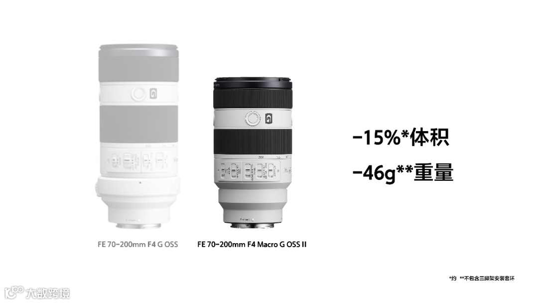 FE 70-200mm F4 Macro G OSS II镜头长149mm,重量约794g(不含三脚架安装套环),体积相比上一代5缩减约15%,重量减少约46g。可轻松胜任包括运动、风光、生态及微距等题材的拍摄。