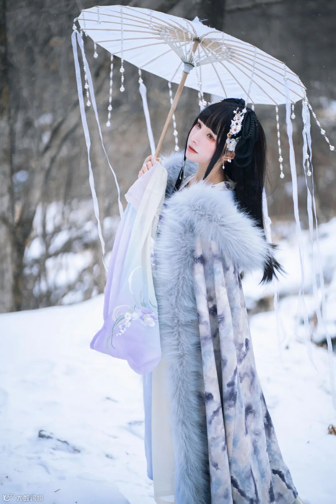 在进行半身拍摄时,将伞带入到画面里,伞上的飘带给画面增加了前后景层次。在俯视拍摄时,翻转屏带给我很好的体验。而Alpha 7C的眼部对焦功能则可以在有前景飘动时,依旧牢牢跟住模特眼部,让我专注于构图和注意模特表情上。