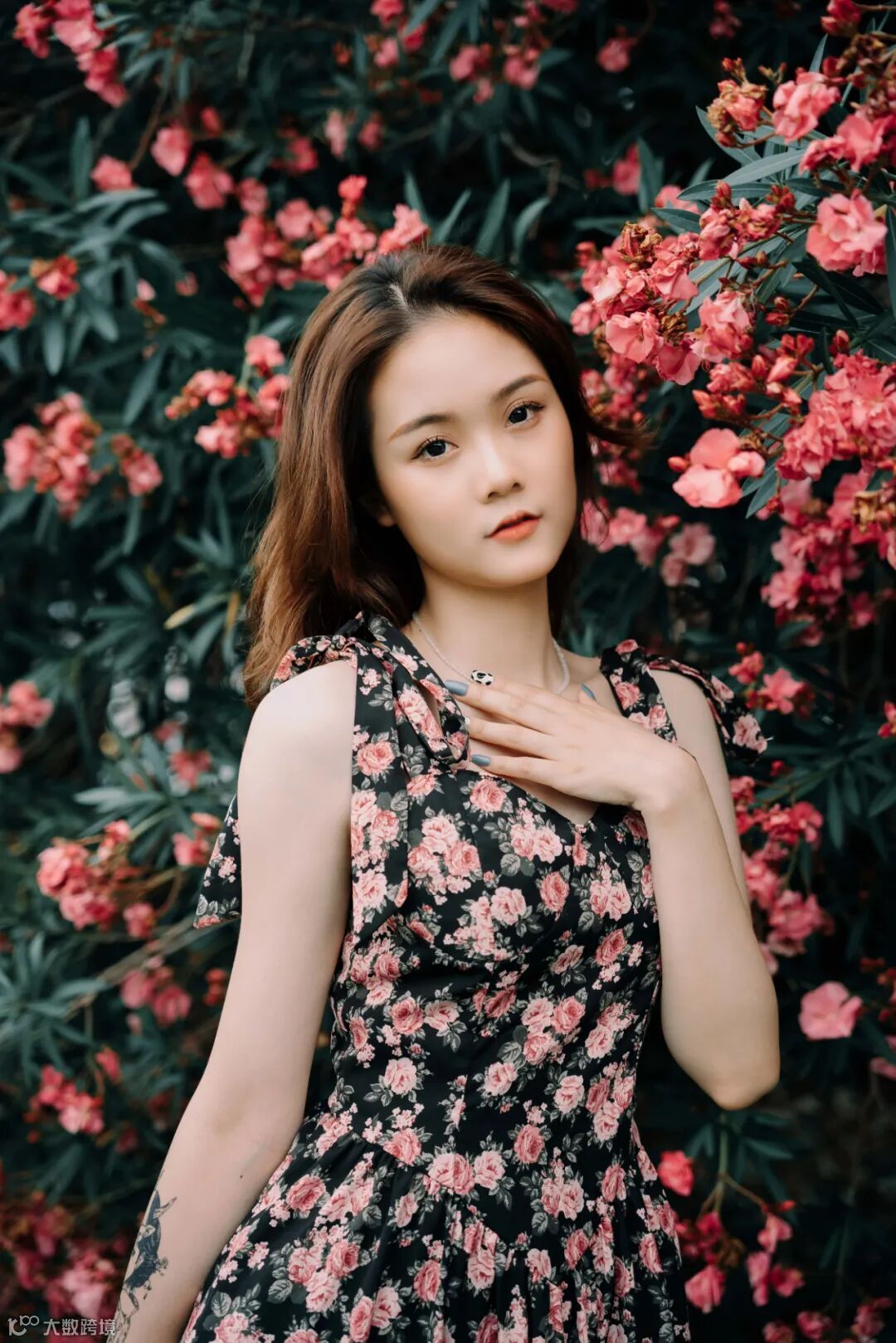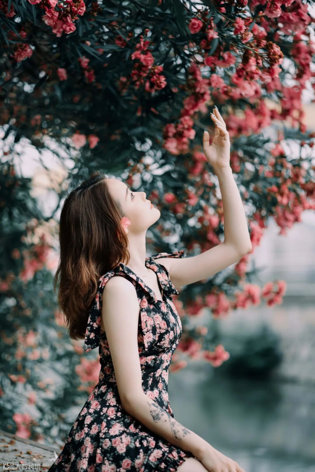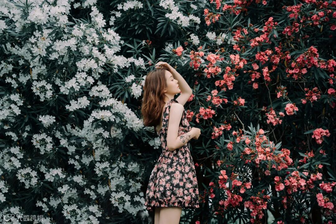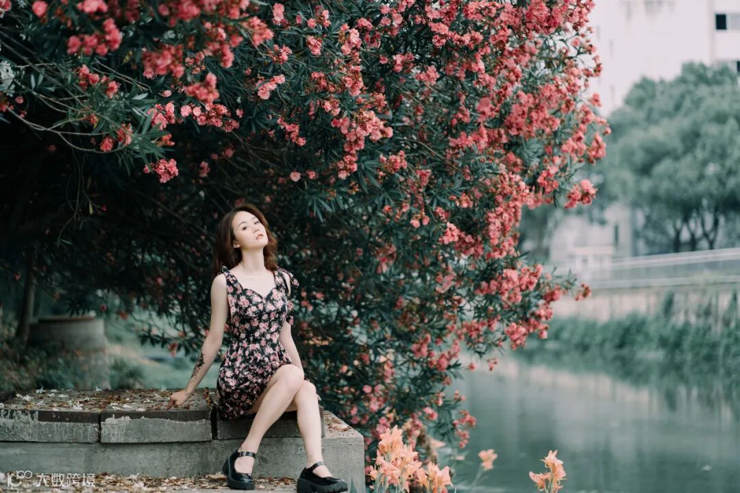 35mm F2.8 1/500s ISO100接下来我们寻找一个有水或湖的地方作为背景,这里的夹竹桃宛如垂柳般的延伸到湖面,非常有层次感,这里使用35mm拍摄,交代环境和人物,背景中的夹竹桃和模特身上的花相映成趣,也述说着这一片明媚青春时光。
