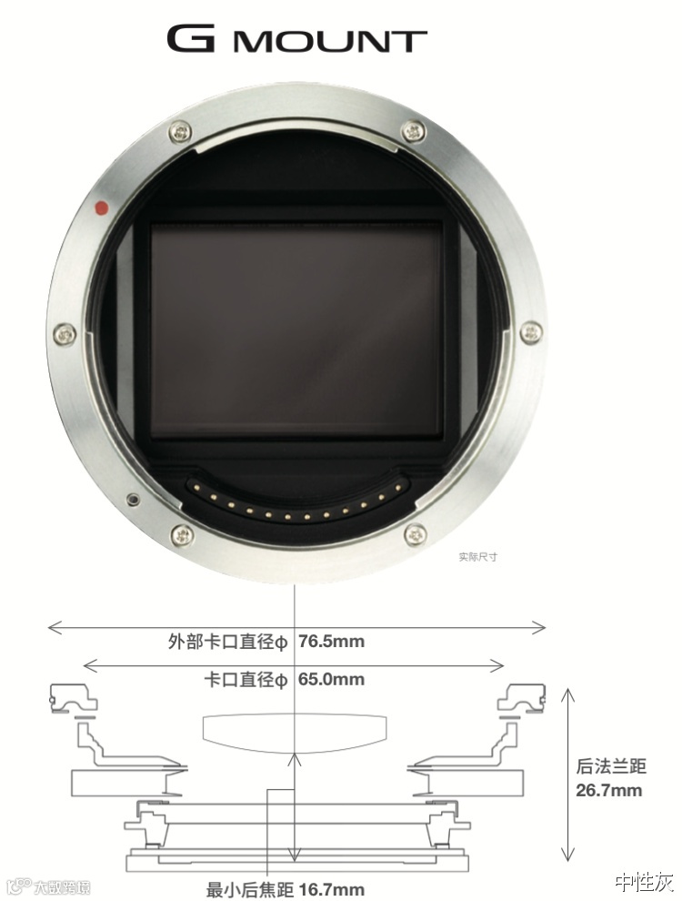 在转接中,我们首先需要了解的是富士GFX中画幅相机G卡口的主要参数。卡口外部直径76.5mm,卡口直径65.0mm,后法兰距26.7mm,最小后焦距16.7mm。了解这些参数后,我们可以通过卡口直径这项参数来筛选镜头。