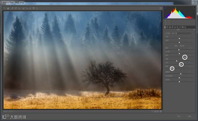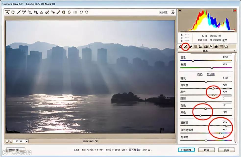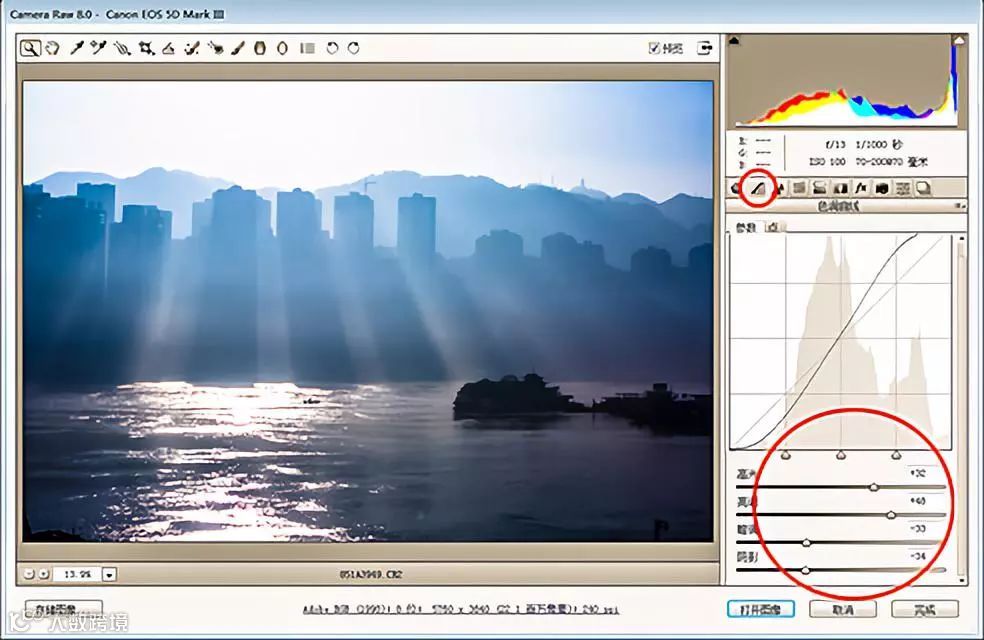 可以看出,画面发灰,需要拉开黑白灰的层次。在 Camera Raw 里,可以直接对暗调和亮调进行微调,很方便,但效果有限: