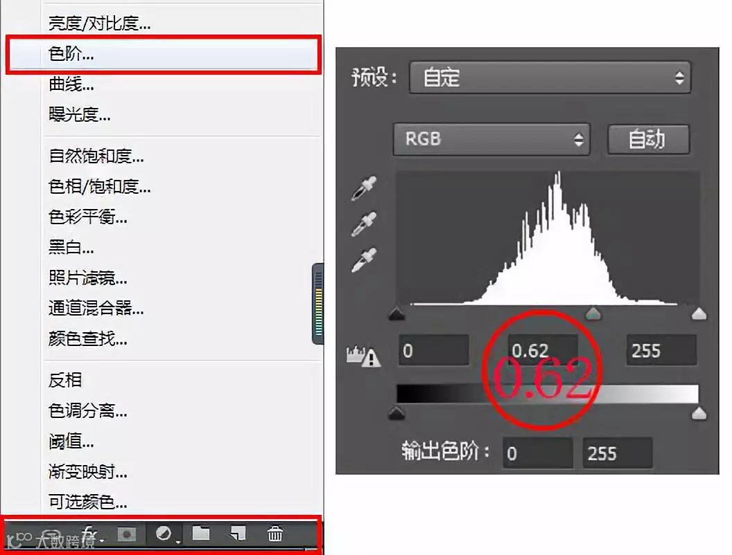 第四步:给低光添加色阶命令。通过第三步中的快捷键选中低光,就可以添加色阶命令。前面的调整虽然恢复了高光、低光各自的光感和颜色,但是画面还是比较平。将数值分别设置成 :0 / 0.62 / 255。你也可以尝试设定不同的数值,观察它们会对画面产生什么样的影响。