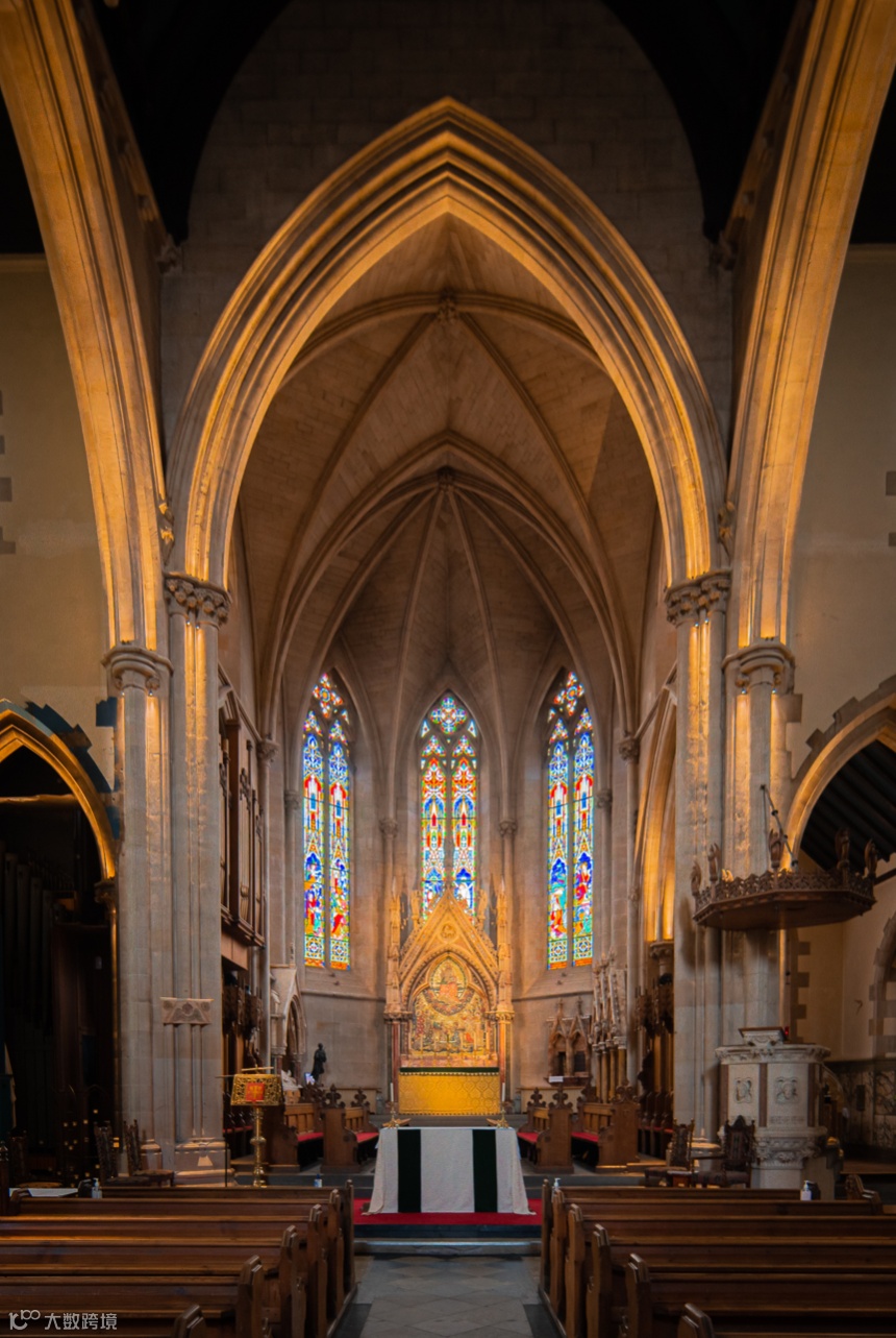 在我的研究中,主体建筑选取为宗教建筑,以大不列颠岛的教堂为主。教堂的特点便是内部空间高。但因此集中于人所在高度的照明便会使内部光比极大。同时彩绘玻璃窗在色彩与光比上对拍摄带来了极大的挑战。在教堂内部拍摄,既要考虑室内人造照明带来的主体部分曝光,也要考虑教堂顶部没有任何照明的曝光,同时还有光线由室外打亮的彩绘玻璃。这无疑是对动态范围与色彩再现能力的挑战。