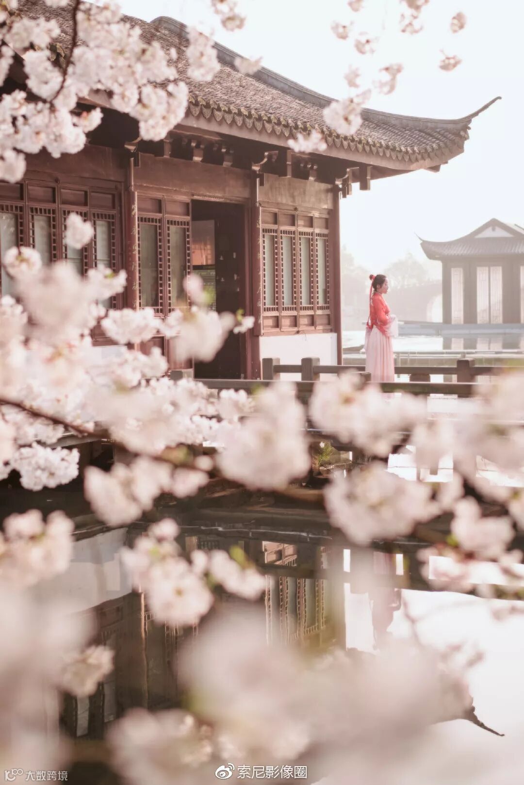 这座位于曲院风荷九曲桥中的建筑,叫“曲渡清波”轩,在其西侧有四棵樱花树,其中一棵最大的是染井吉野樱花树。这颗樱花树向湖面伸展,刚好将建筑包裹在黄金分割点的位置,构图上非常完美,夏天日出正好在画面右上方,光线角度极佳。这里每到春天时候是摄影师必打卡的地方,清晨5点就已经没有机位。