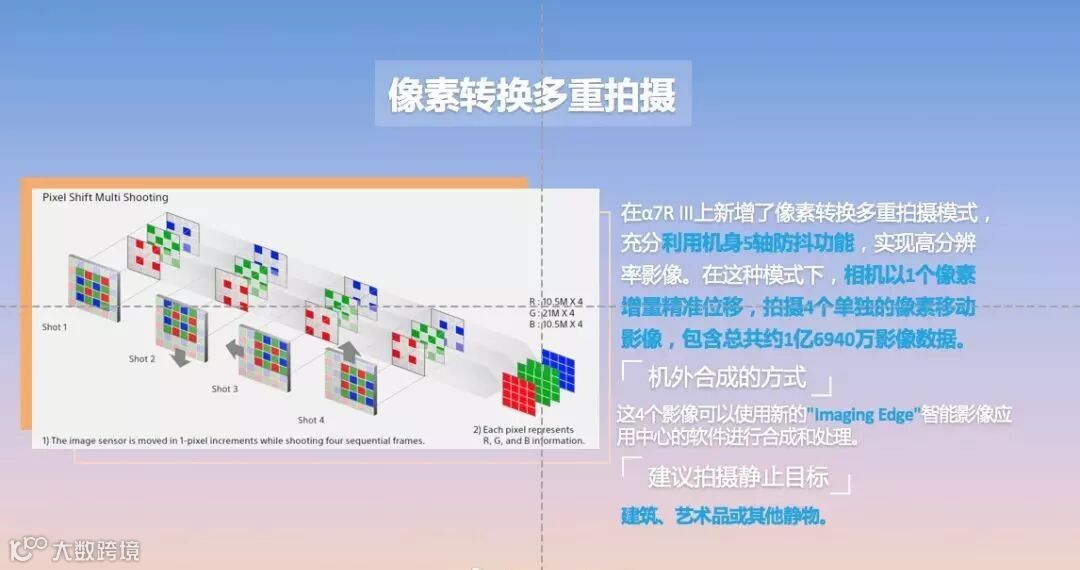 我们可以看到,像素转换多重拍摄功能让CMOS以一个像素量的单位位移三次,拍摄四张照片,并通过Sony Imaging Edge软件(官网免费下载)机外合成的方式,合成一张具备了约1.69亿像素信息4240万像素的照片。