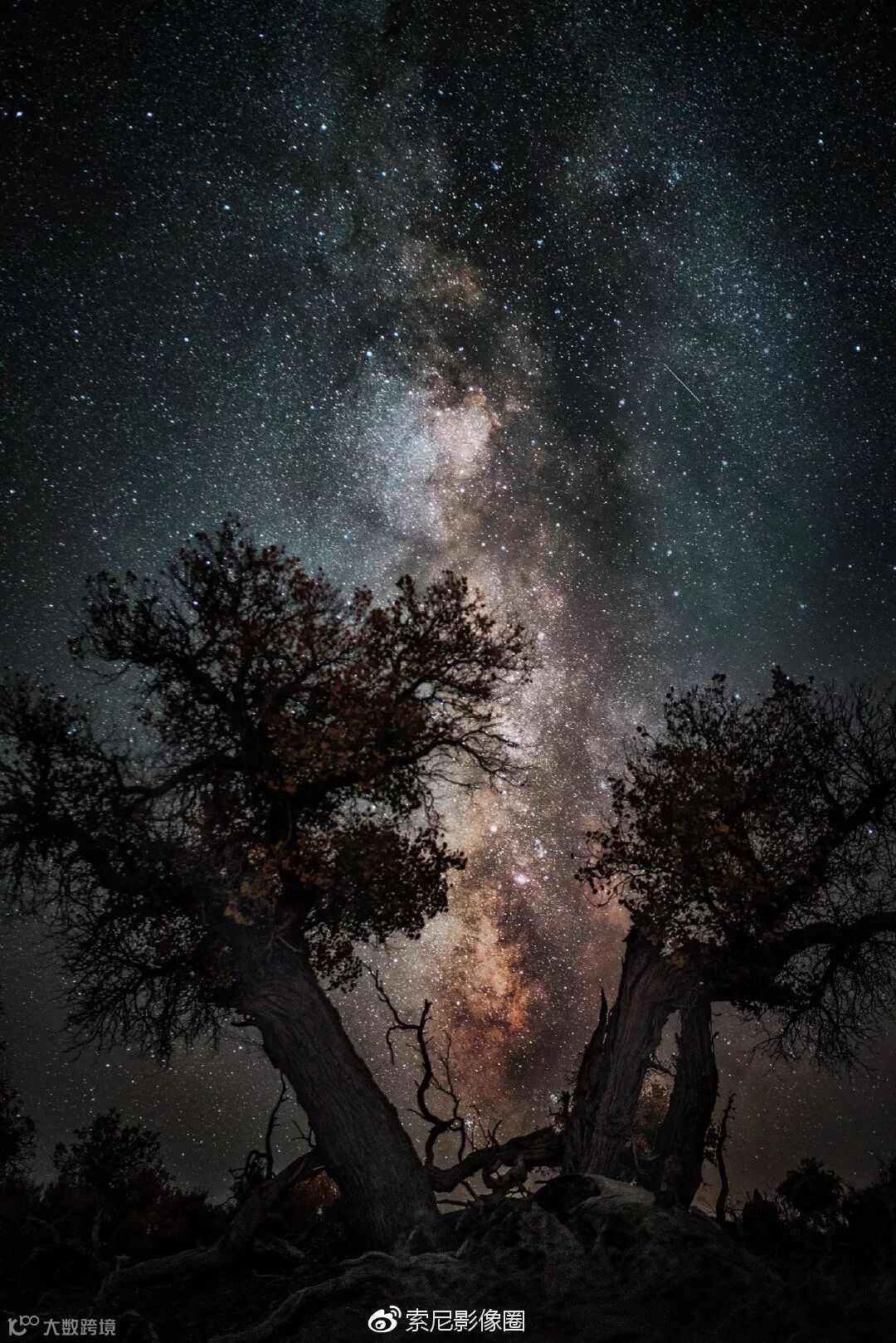 由于纬度和季节原因,银河早早挂在了天上,若想在胡杨林中拍摄星空需要在天亮的时候提前找好机位。沙漠星河离不开胡杨做前景。