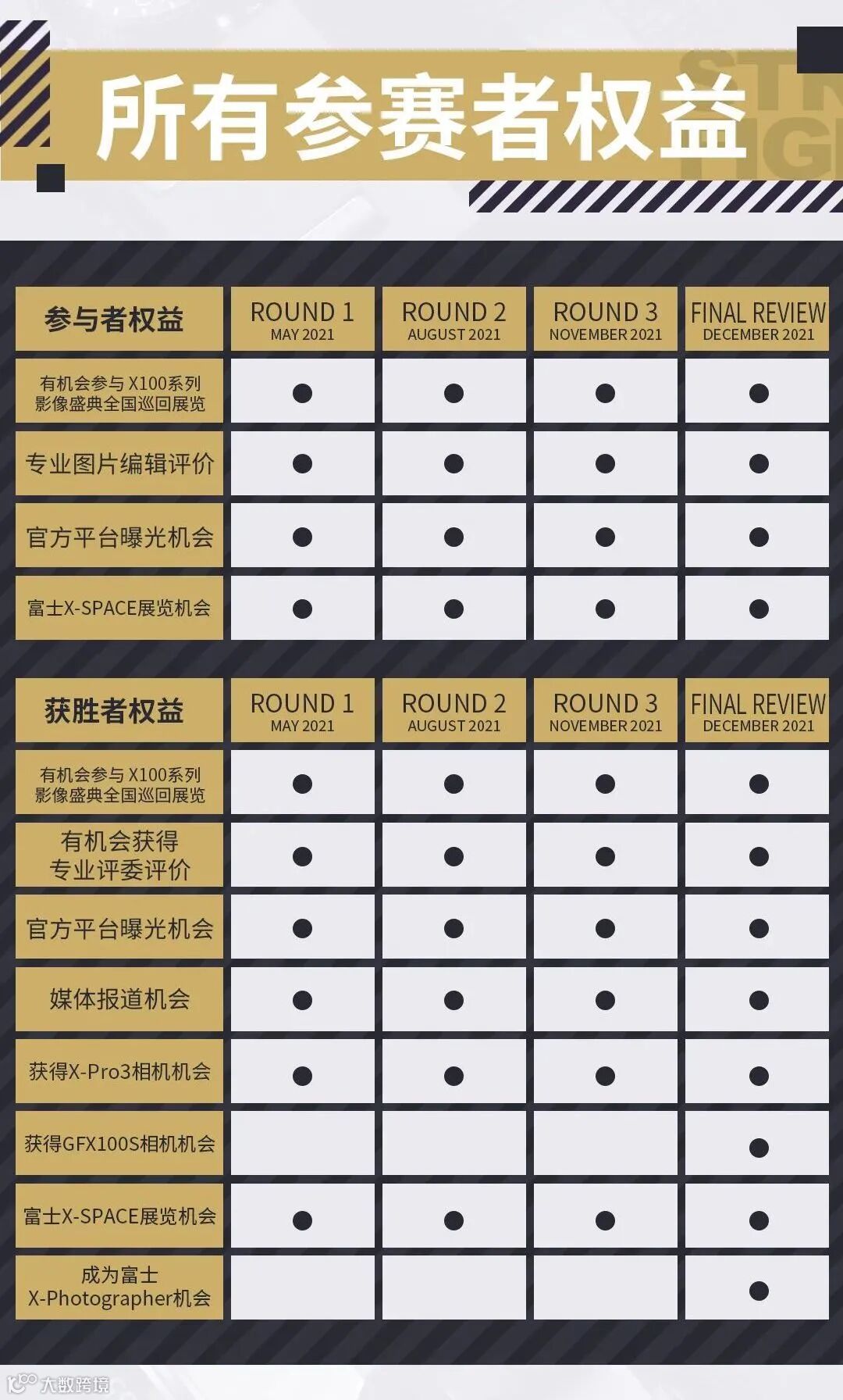 本次大赛没有器材限制,不论是否是富士品牌的相机均可,不论是相机、手机甚至行车记录仪均可,但如果作品使用X100系列相机拍摄,所得奖品均会有升级加成。