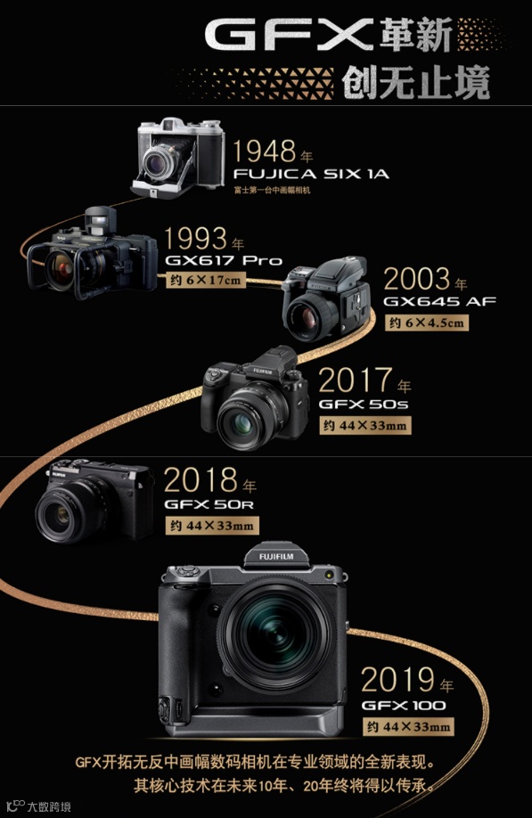 进入数码化时代以来,从 2017 的数码中画幅相机 GFX50S(小体积5千万像素)到 GFX100(大体积1亿像素)再到 GFX100S(小体积1亿像素)目前最轻便的 1 亿中画幅。