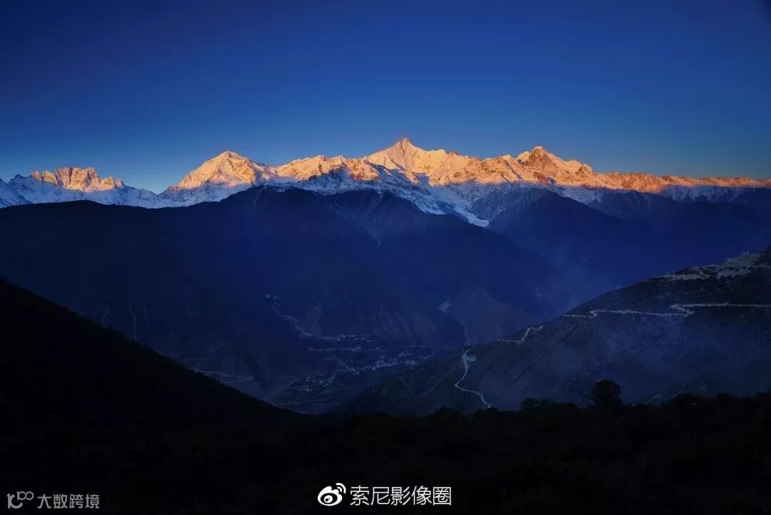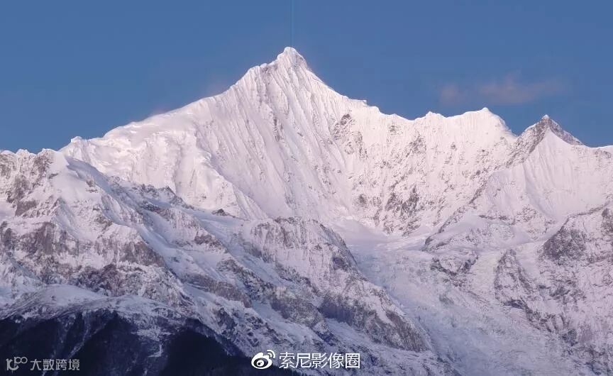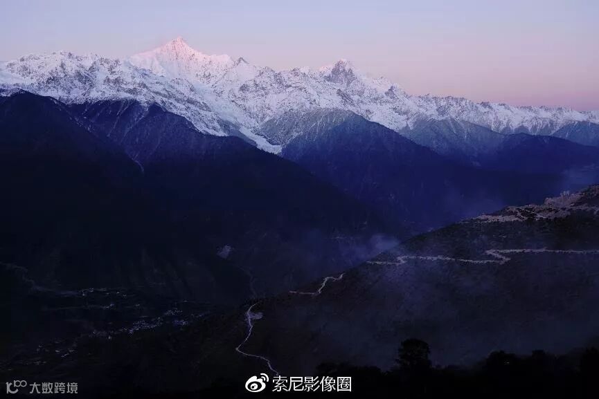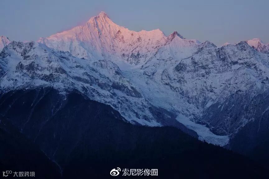 105mm长焦端,拍摄梅里雪山主峰卡瓦博格峰。正好能够拍到清晨第一缕阳光照到峰顶的瞬间。冬天的阳光,不像夏日那么热烈,微微的暖色,带点粉红,有种淡淡的美。