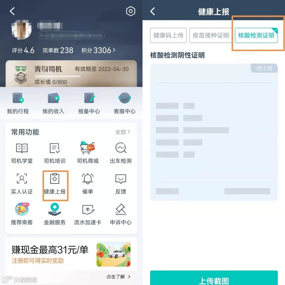 加强从业人员核酸检测。 即日起,网约车驾驶员每天进行一次核酸检测,或每间隔24小时交替进行一次核酸检测和一次抗原检测。并将检测结果上传至享道司机端—个人中心—健康上报。