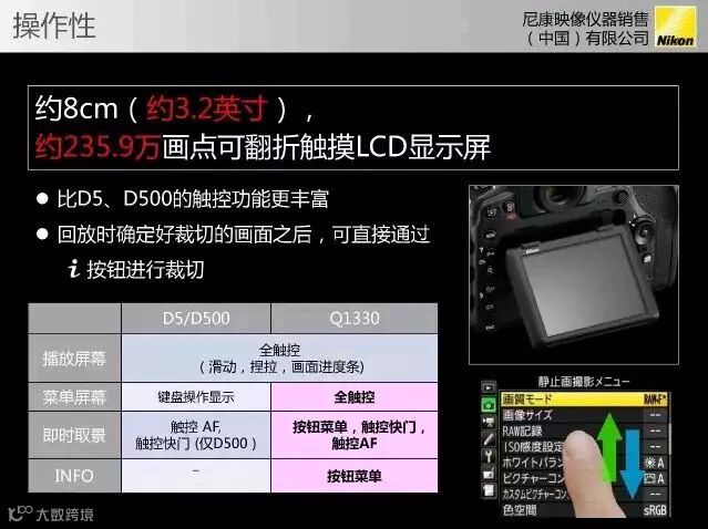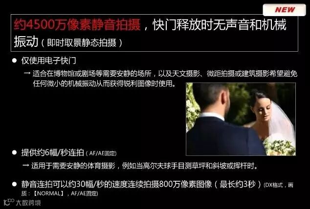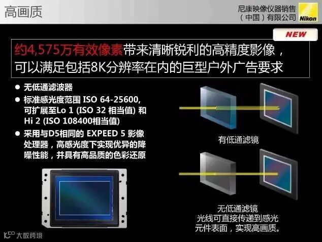 尽管官方尚未公布D850具体的发布时间,但D850的核心规格信息已不再是秘密。这款D810继任者的官方演示文稿目前已经在网络上曝光,从其中涉及到的机身规格及特性来看,D850无疑可堪称是尼康至今为止集单反技术之大成之作。如早前传闻所示,新机采用4575万像素全画幅传感器,最低原生感光度依旧维持在ISO64的水准,最高感光度则提升至25600,搭配承袭自旗舰级相机D5的EXPEED 5处理器以及153点自动对焦系统,具备8K延时摄影模式和4K视频拍摄模式,这些已经不再会是令人感到惊讶的信息了。但与此同时,D850竟然还拥有高达9fps的连拍速度,且在静音模式下仍然具备6fps连拍速度。屏幕方面也不仅仅是将固定屏幕改为翻转式屏幕那么简单,新机这次搭载的是一块235.9万画点的触摸式翻转LCD。其他让人眼前一亮的规格还包括了全新的景深合成模式、0.75倍放大倍率光学取景器、SD和XQD双卡槽、增设L\M\S三种尺寸的RAW文件等诸多特性和技术。