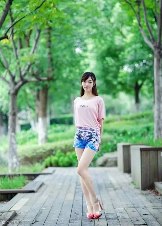 使用向上仰拍的方式或使用广角镜,可以将女生拍摄出腿长或苗条的效果,拍摄时让模特稍微抬起头,可以使眼睛看起来更漂亮。
