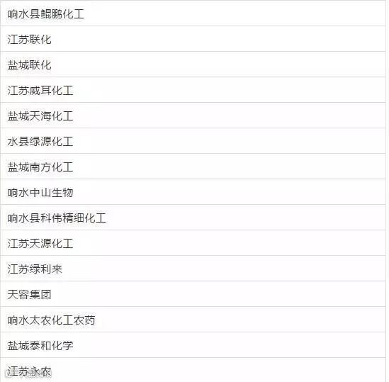 此外,盐城市率先决定,永久性关停响水化工园区,园区内共有100多家企业,其中涉及到农药及农药中间体企业名单现公布如下: