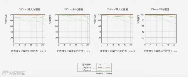 从官方给出的MTF曲线来看, 无论是200mm还是600mm的锐度都很好,尤其是长焦端更好一些,中心和边缘基本能够保持一致的锐度。