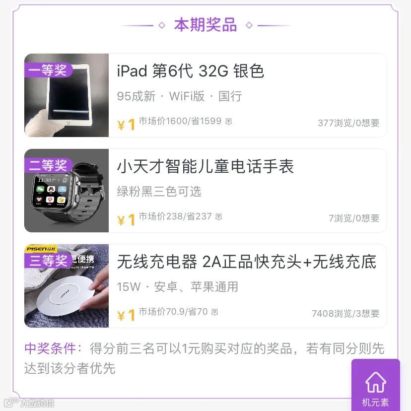 登录机元素小程序后即可参与本活动,每天有2次参与机会,活动期间邀请新用户可获得额外共5次参与机会,最后获奖者以1元购买对应奖品!