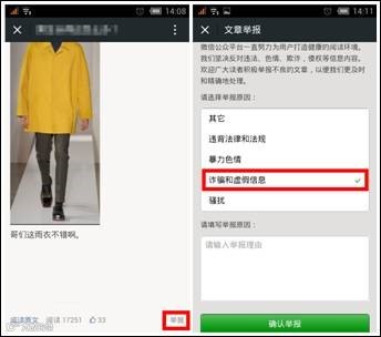 1朋友圈中文章,点击底部“举报”按钮;公众号推送内容,点击消息处,选择“投诉”