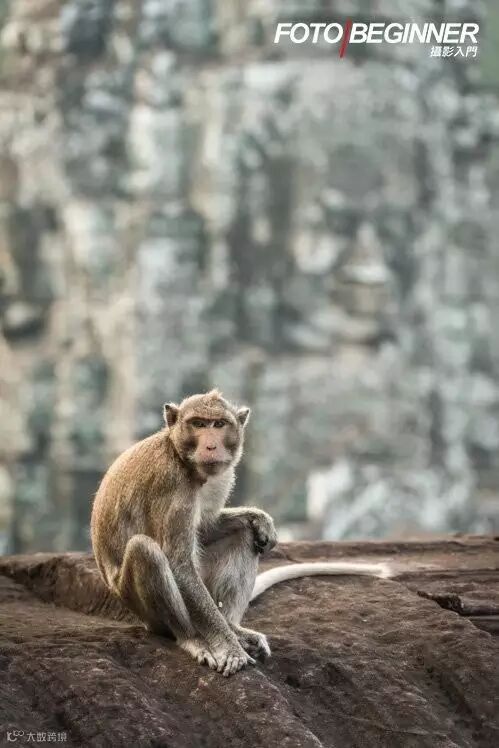 猴子刚好坐在雕像旁,要把握机会拍摄。