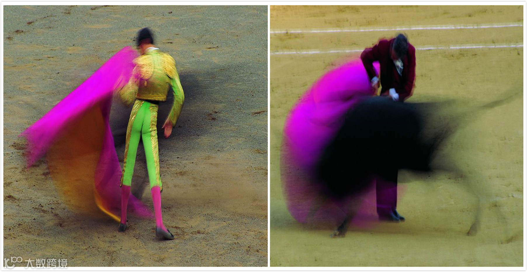 摇拍还有一种是将主体和背景都模糊掉,这种技法常适用于色彩对比鲜明、阴影部灰度色阶丰富的画面。例如西班牙摄影师Ricardo B Sanchez拍摄的斗牛。