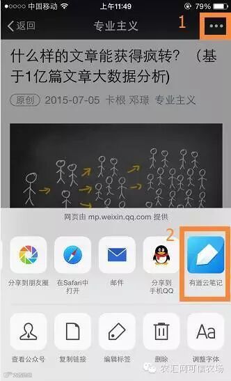 点击订阅号文章页右上角「…」,选择保存文章到「有道云笔记」,笔记公众号对话框将弹出「保存成功」的提示。