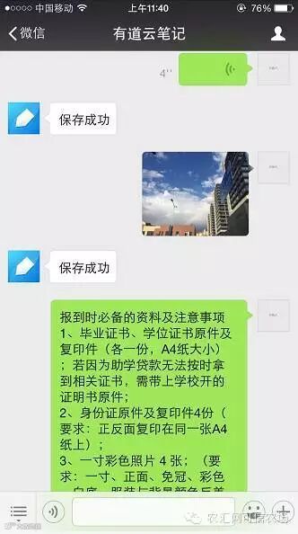 打开有道云笔记微信服务号,像与朋友对话一样,给笔记君发送图文、语音或视频信息,笔记君通过微信服务号回复「保存成功」,即表示信息已保存到绑定的有道云笔记账号中。