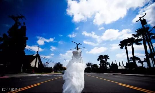 将概念上对立的东西放在一起拍摄,会营造强烈的效果,也让照片变得有趣。例如上图在广阔的户外空间,放置理应是室内陈列的漂亮婚纱;又或是下图,洁白纯真的新人与婚纱,对比墙上的街头涂鸦,也让照片更加耐人寻味。